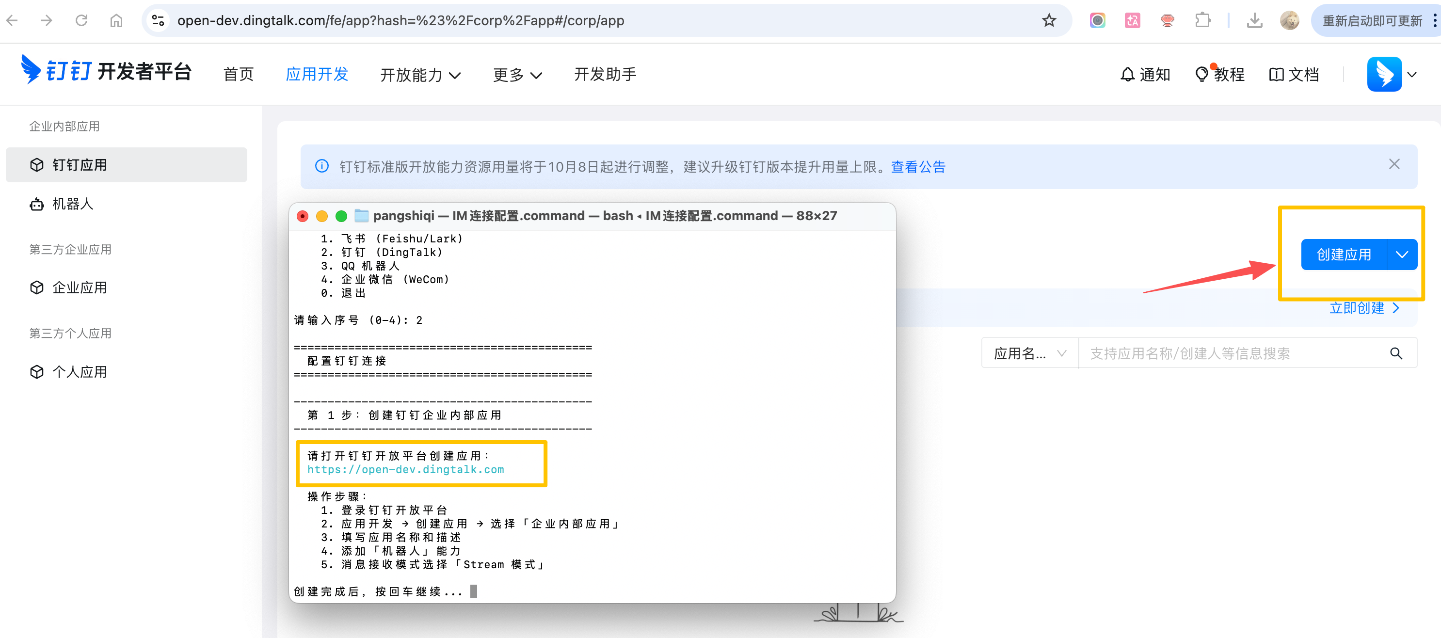 脚本启动后,在终端中输入对应数字选择要配置的 IM 平台:输入 2 并回车,选择钉钉。