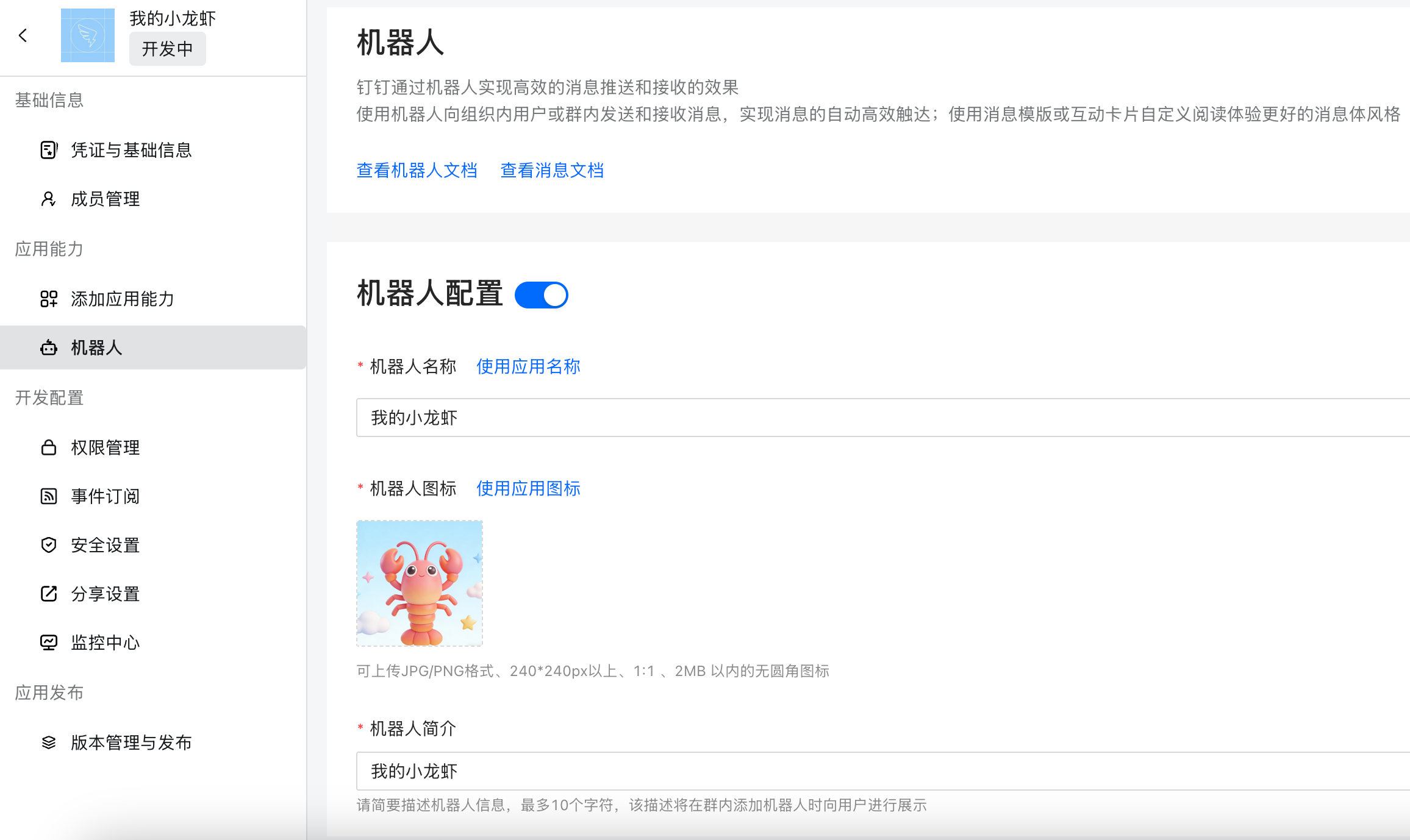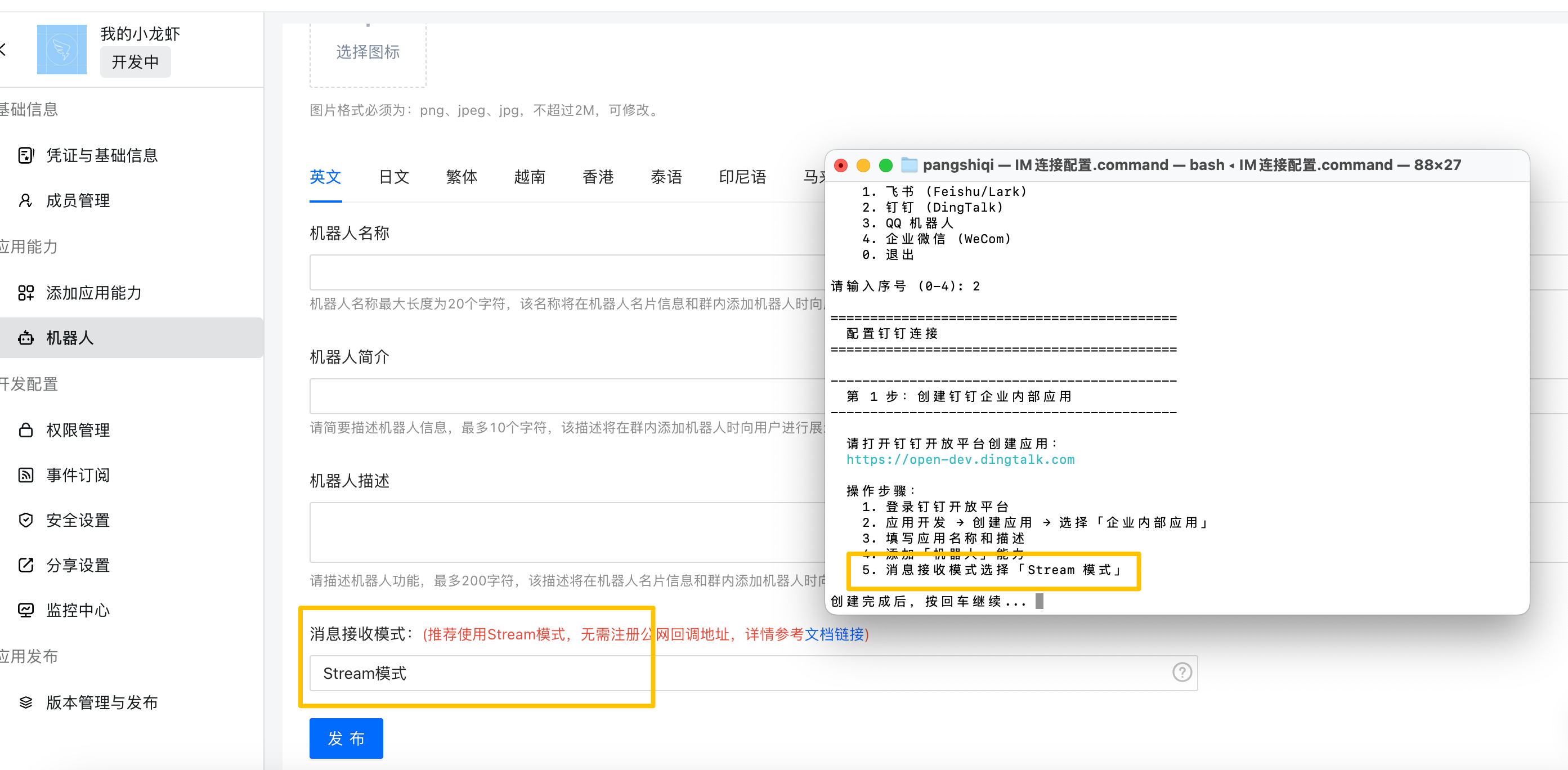 - 进入「机器人配置」,将 消息接收模型 设置为 Stream 模式