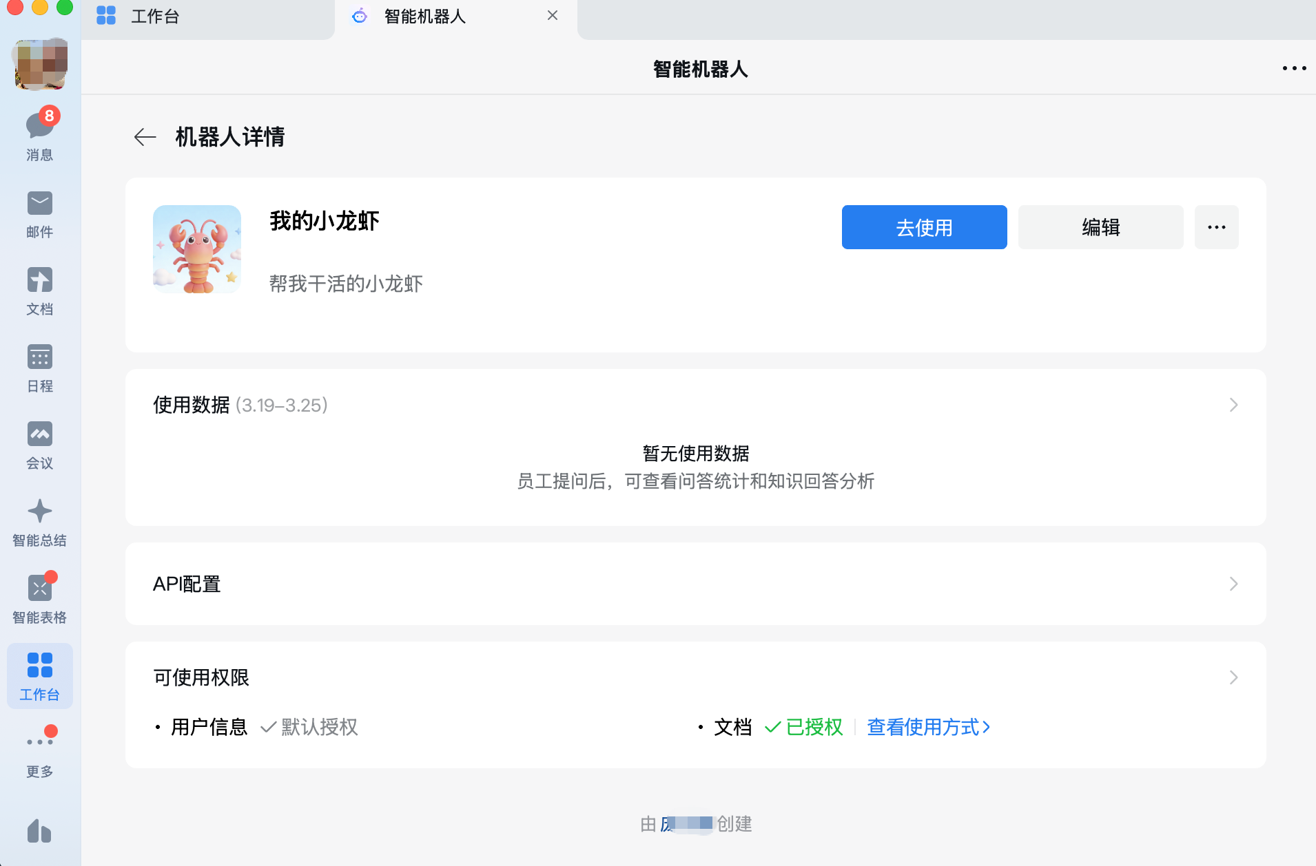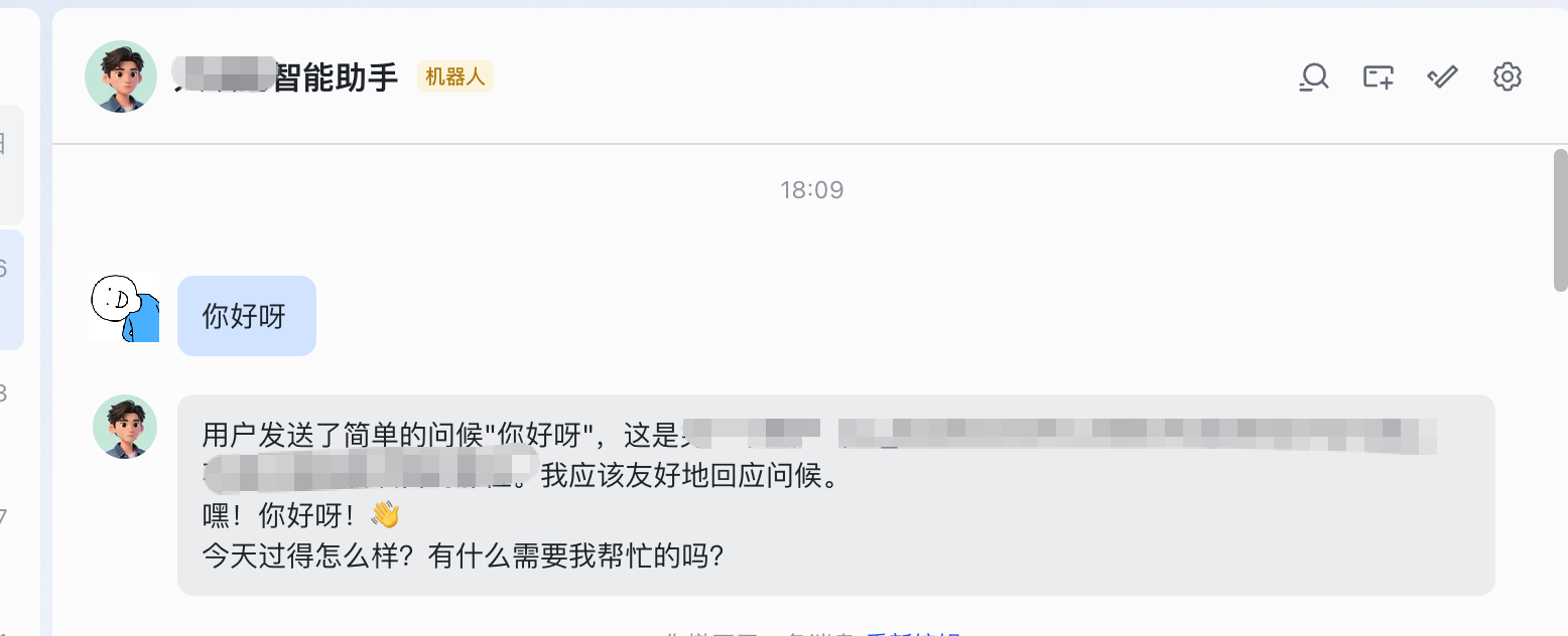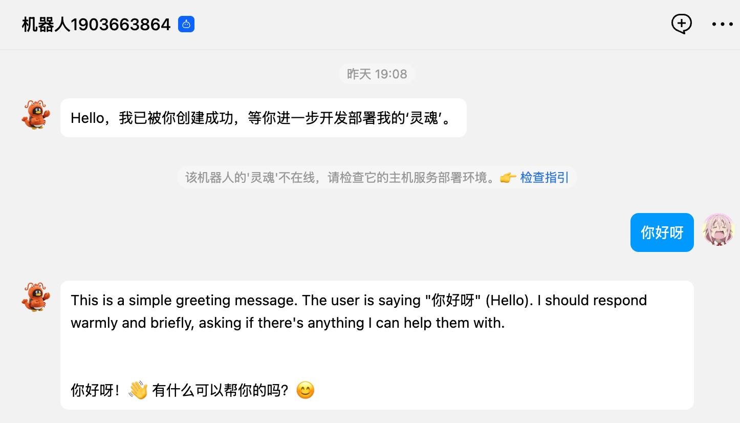 - 进入应用对话界面,发送一条测试消息。正常回复,则表示插件配置成功。