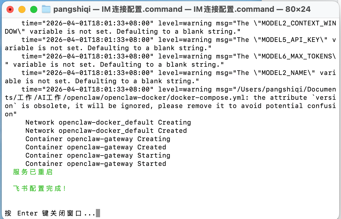 配置完成后,终端会提示“配置完成”,服务将自动重启。
