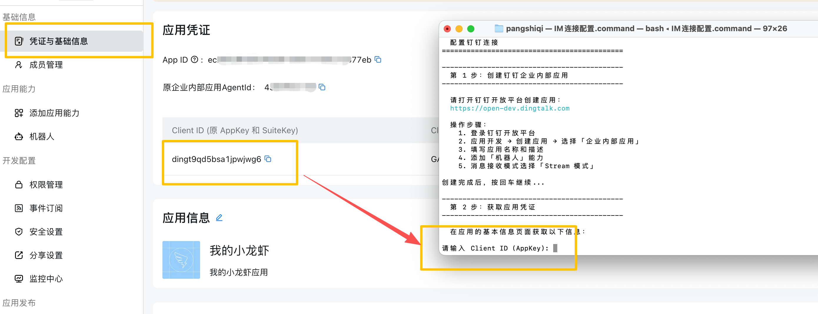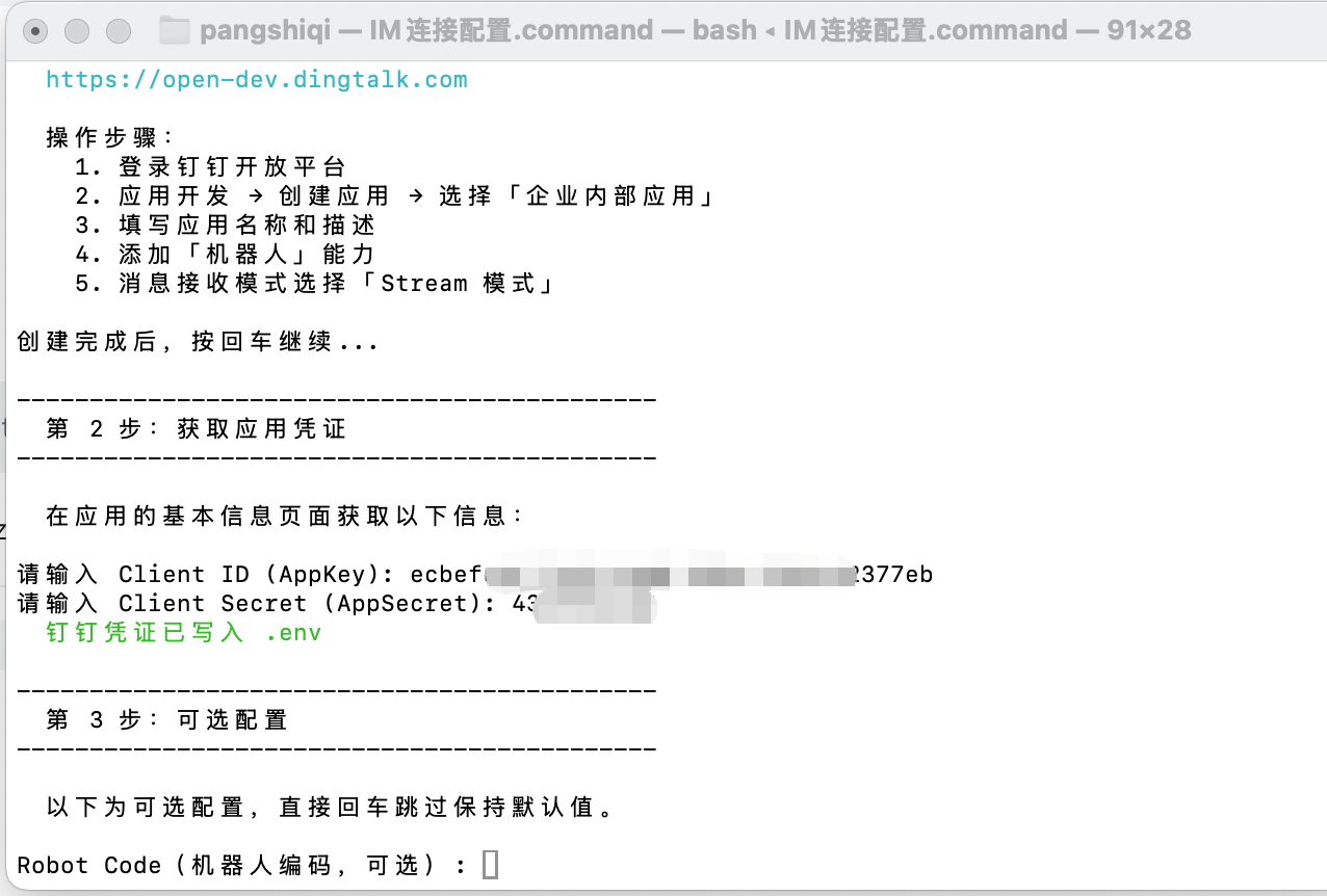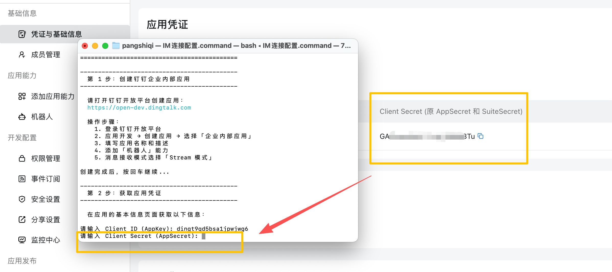 - 在终端脚本中,按提示依次输入“client ID”、“Client Secret”,并回车。