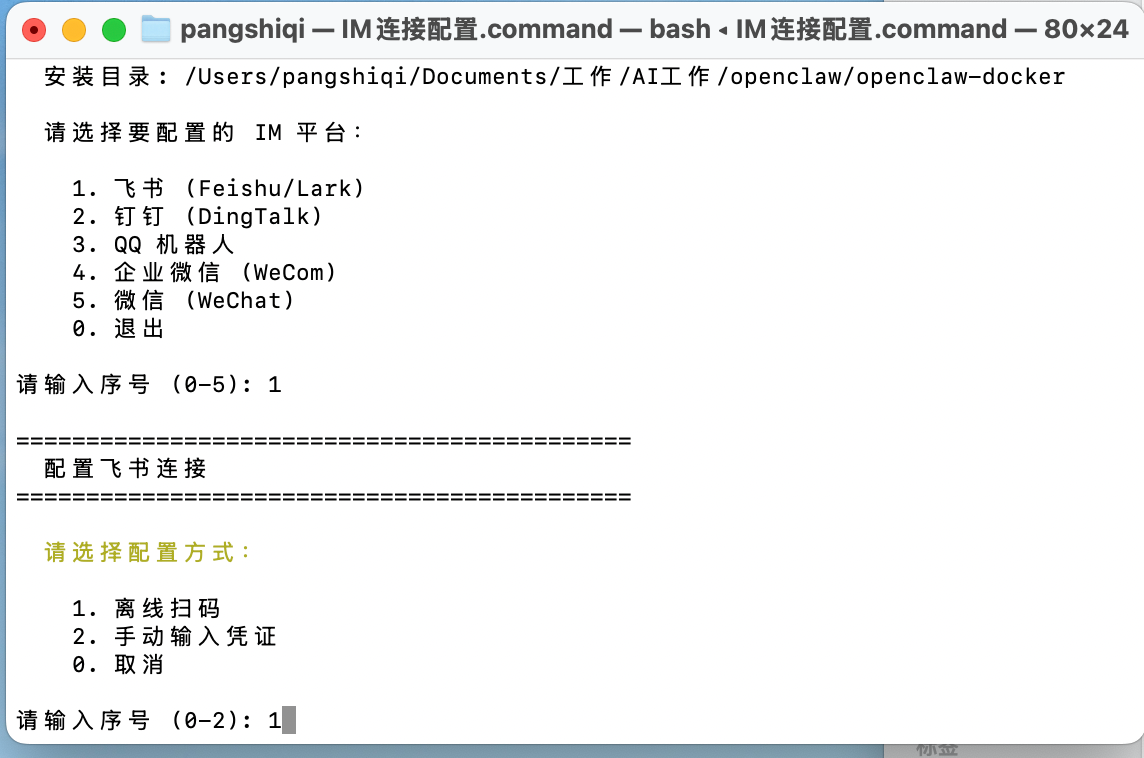 脚本启动后,在终端中输入对应数字选择要配置的 IM 平台:输入“ 1” 并回车,选择飞书。