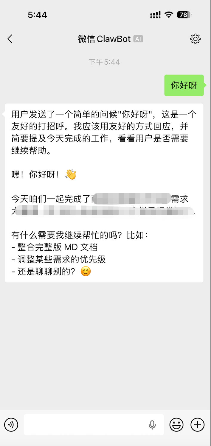 连接成功后,可直接在「微信机器人」对话界面中,发送一条测试消息。正常回复,则表示配置成功。