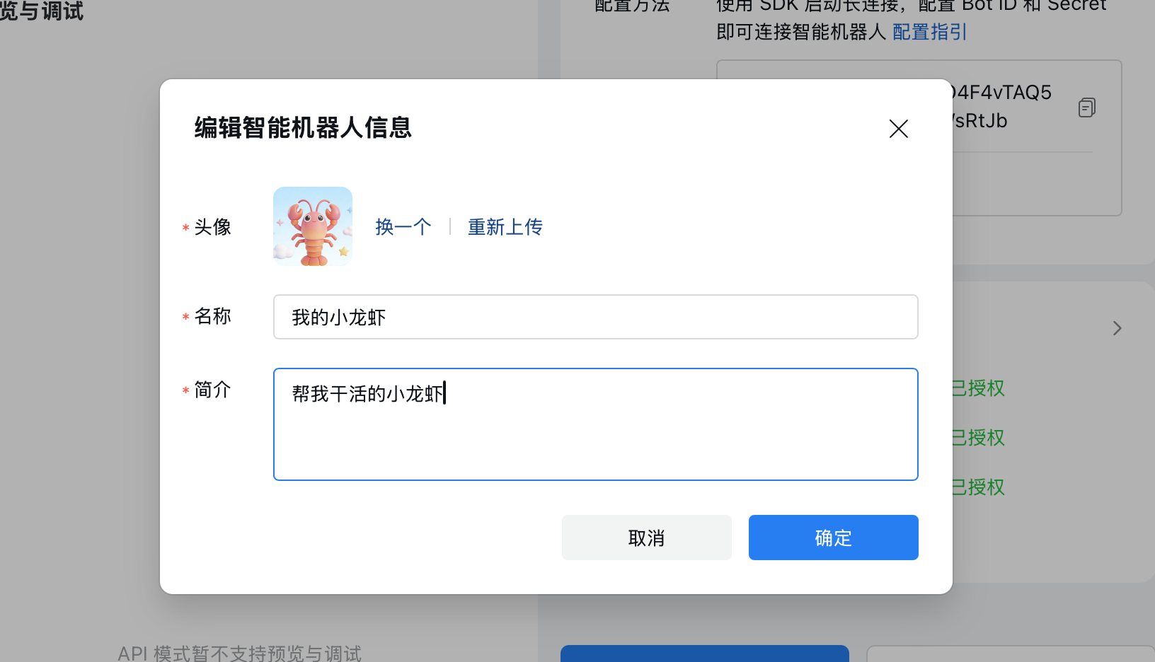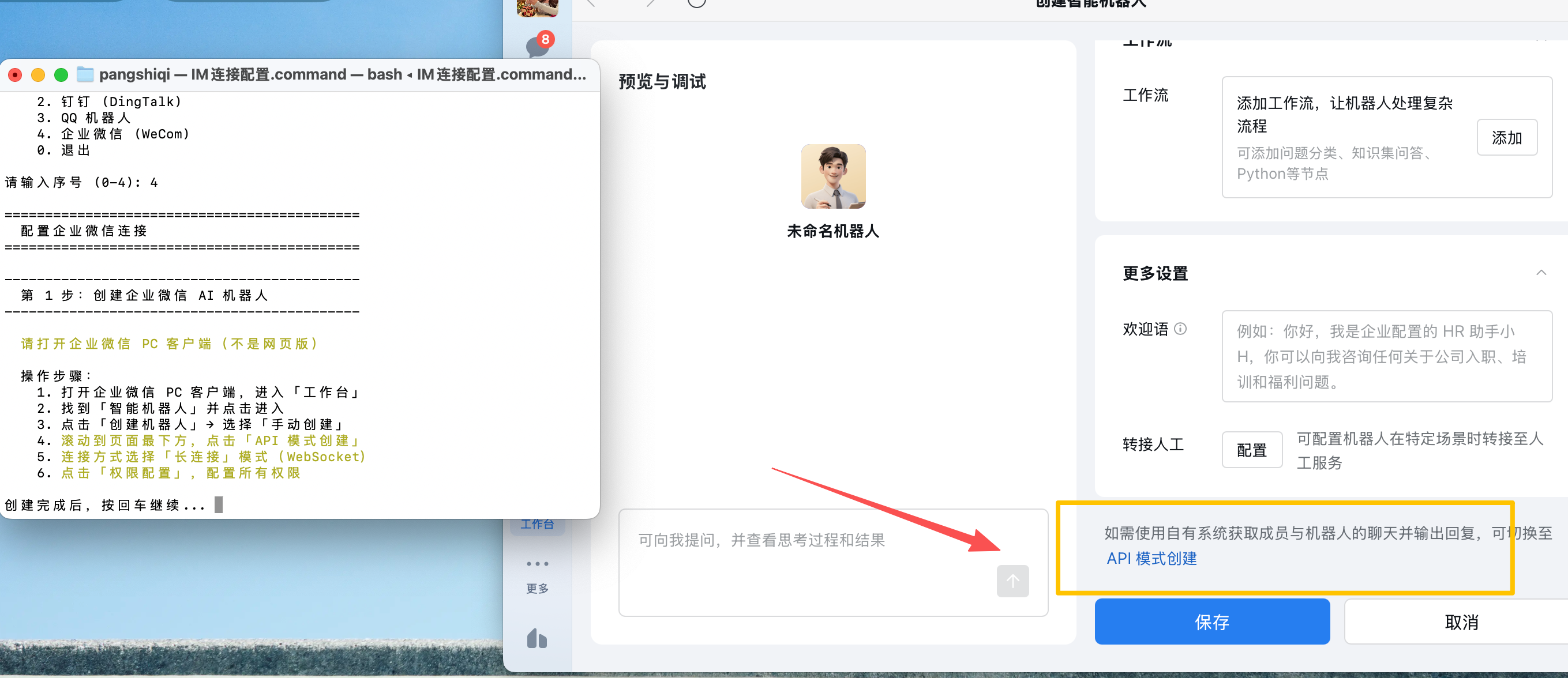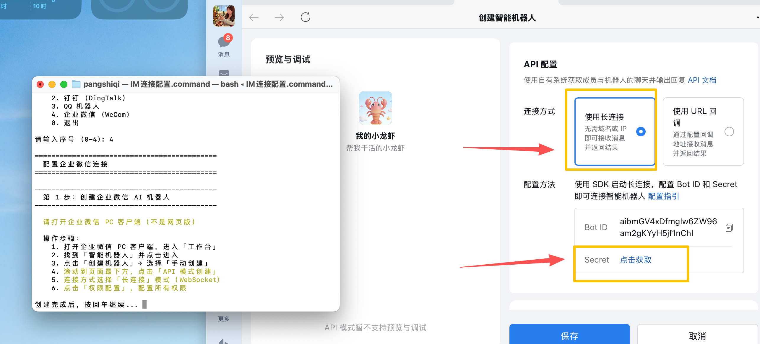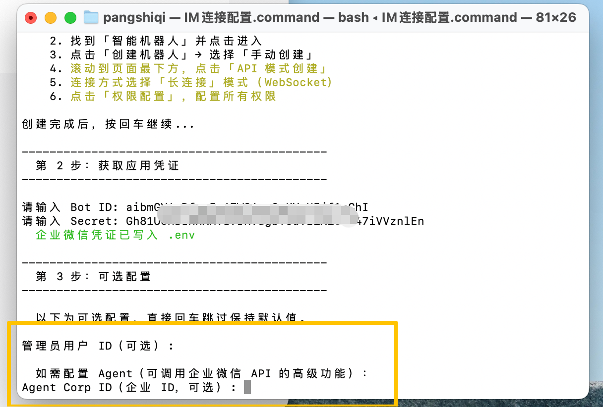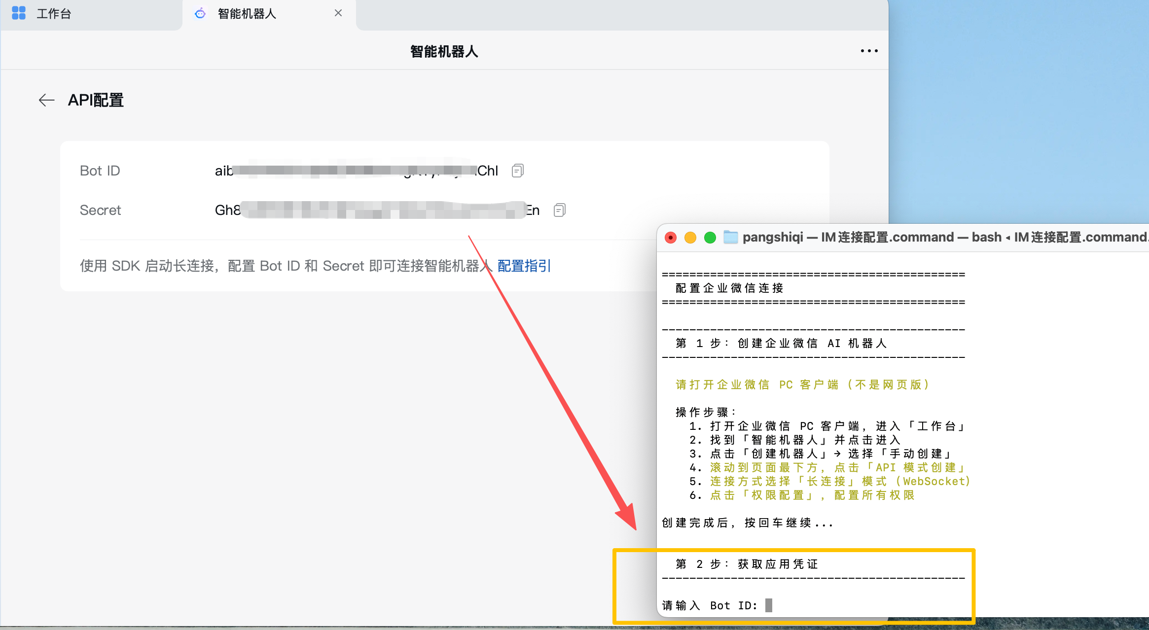 - 进入「API配置」,在终端脚本中,按提示依次输入“Bot ID”、“Secret”,并回车。