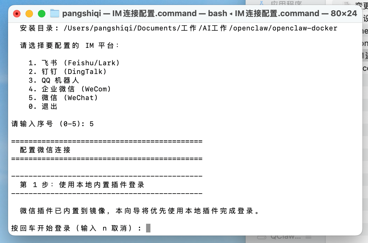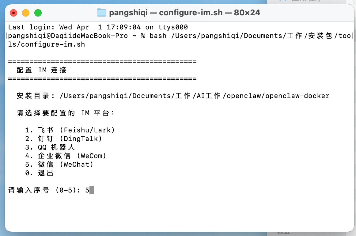 脚本启动后,在终端中输入对应数字选择要配置的 IM 平台: