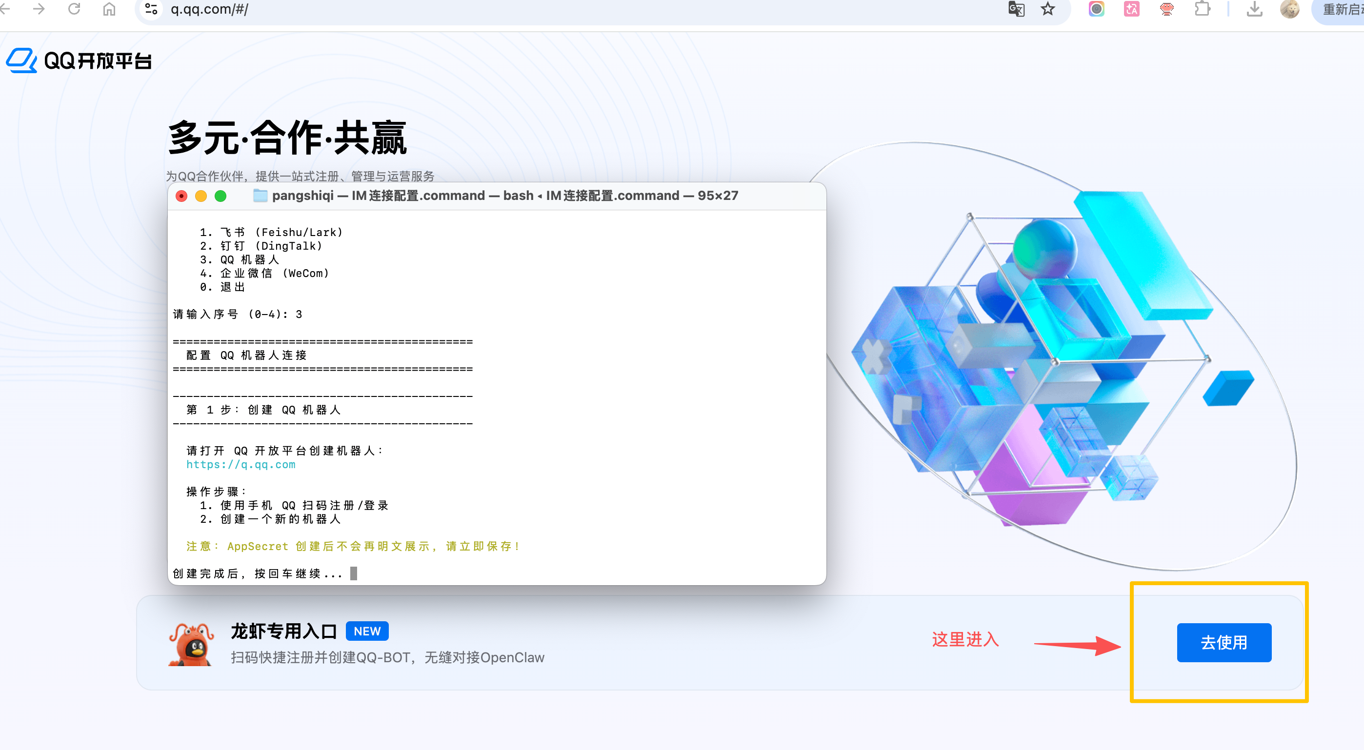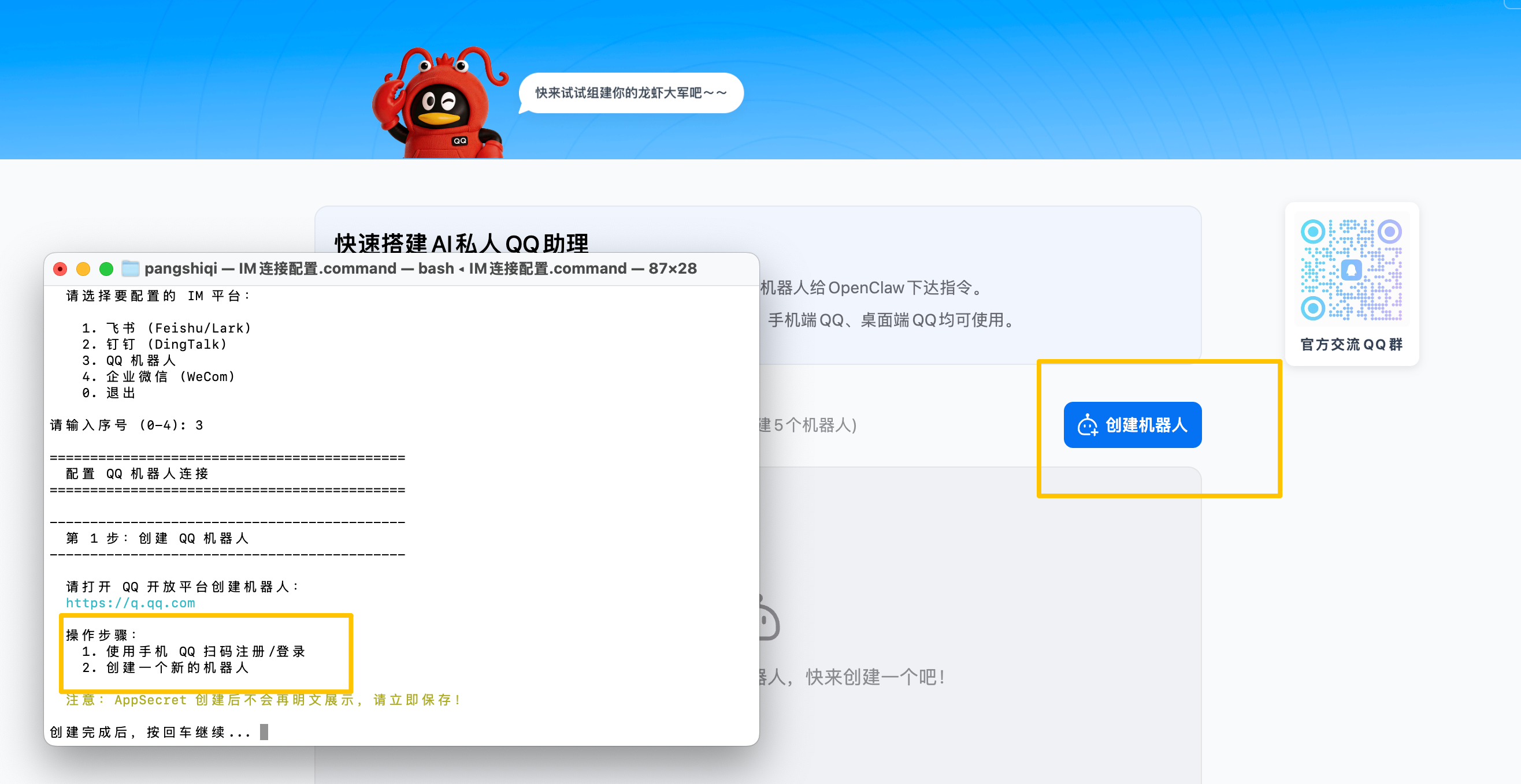 - 访问 QQ开放平台 ,进入“龙虾专用入口”进行快速创建