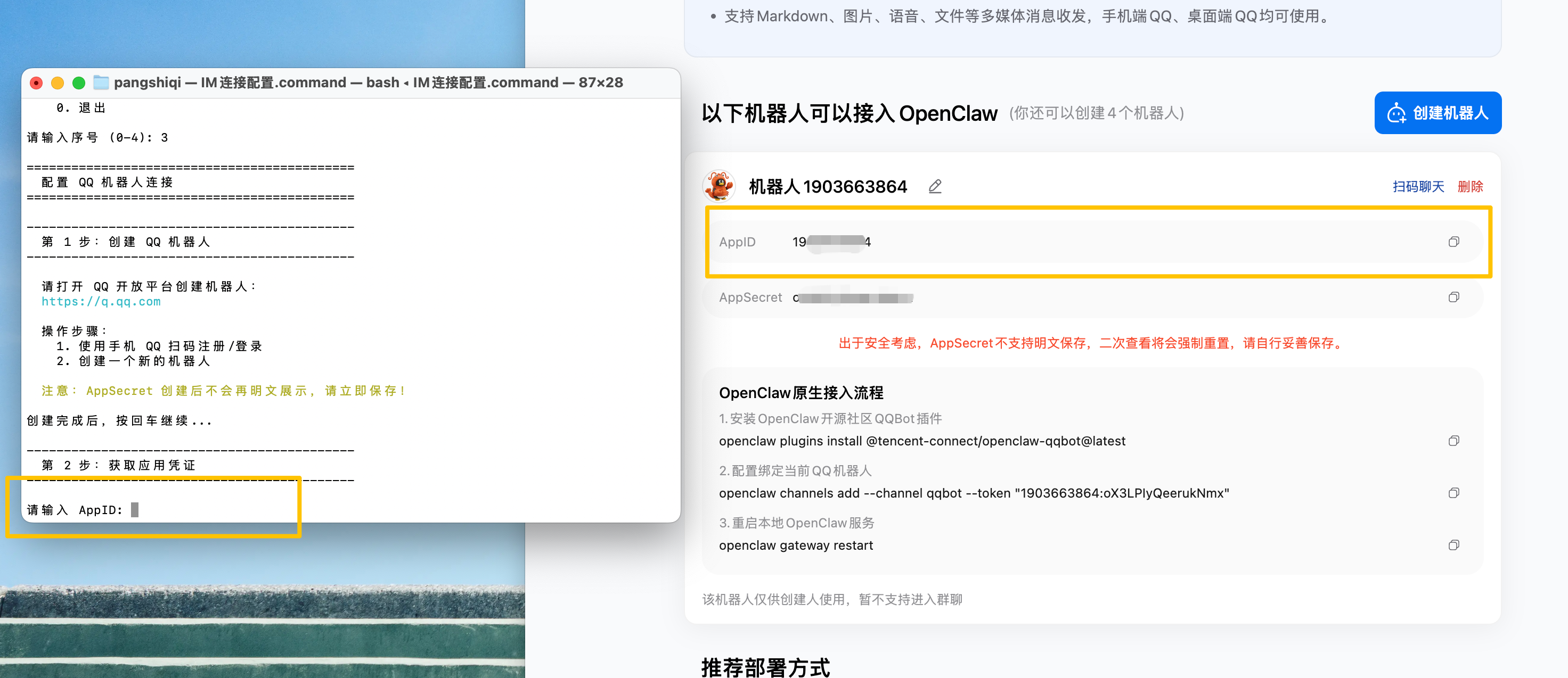 在终端脚本中,按提示依次输入“App ID”、“App Secret”,并回车。