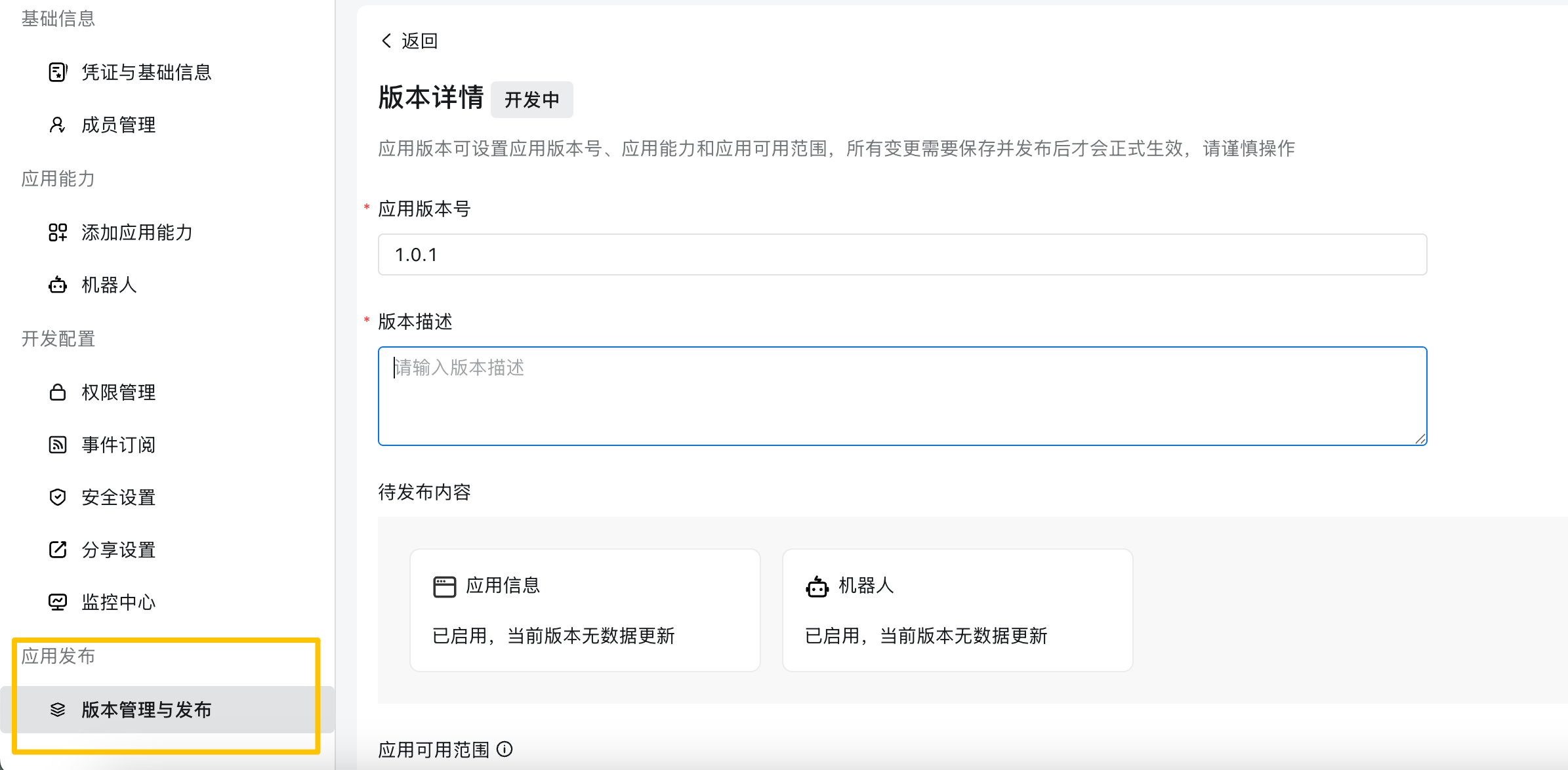 - 打开「版本管理与发布-创建版本」,填写应用版本号(如:0.0.1) 与版本描述,完成创建。