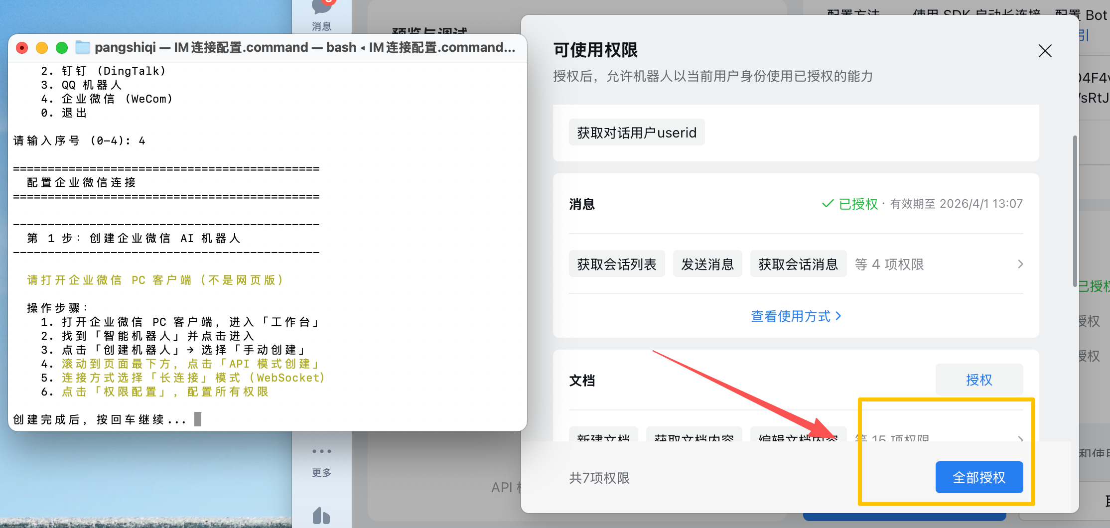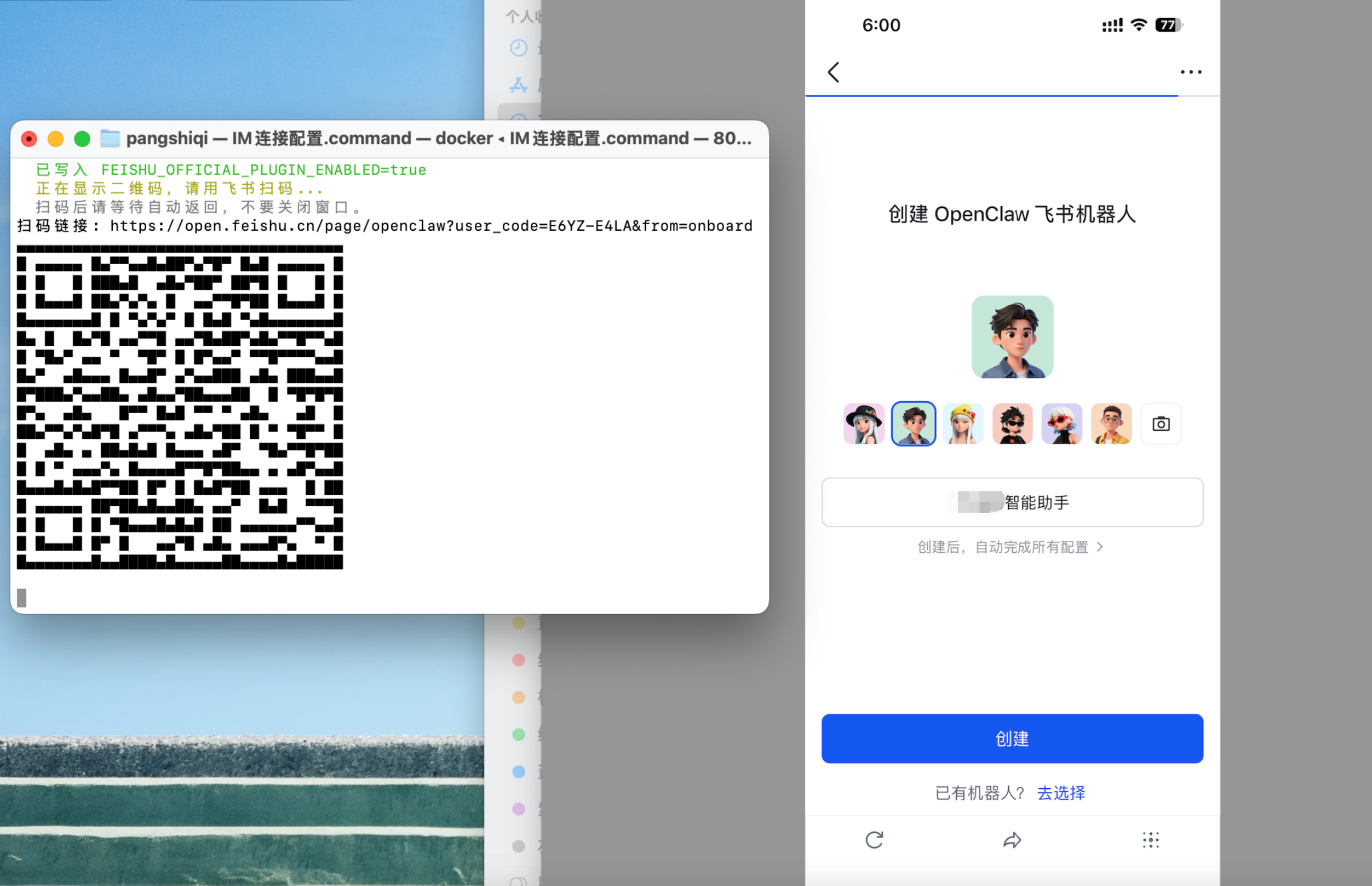 整个过程无需手动在飞书开放平台进行任何操作,配置将自动完成。