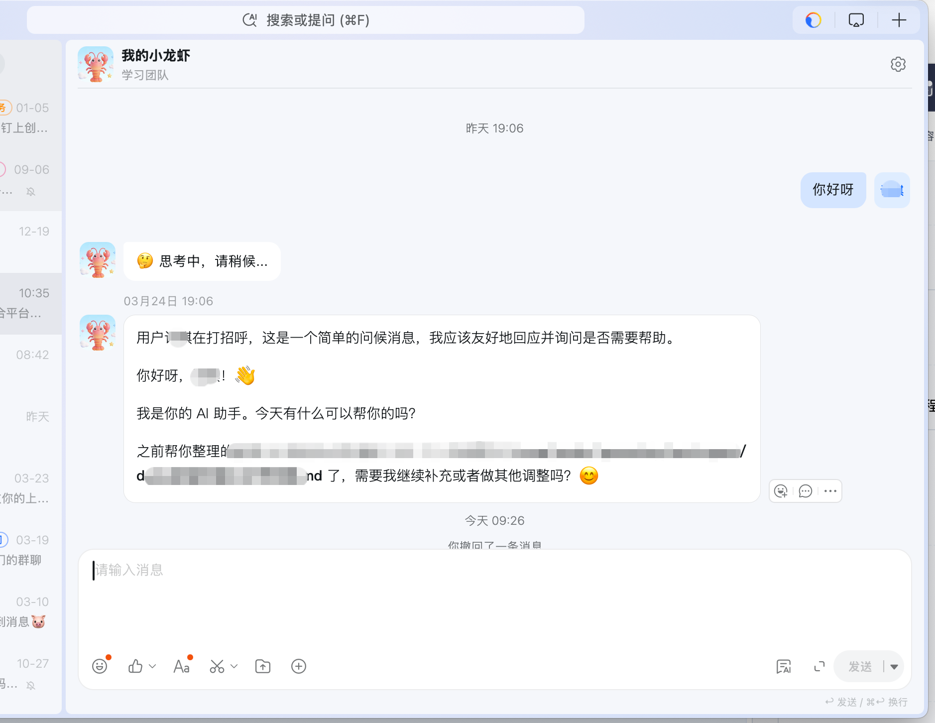 - 进入应用对话界面,发送一条测试消息。正常回复,则表示钉钉插件配置成功。