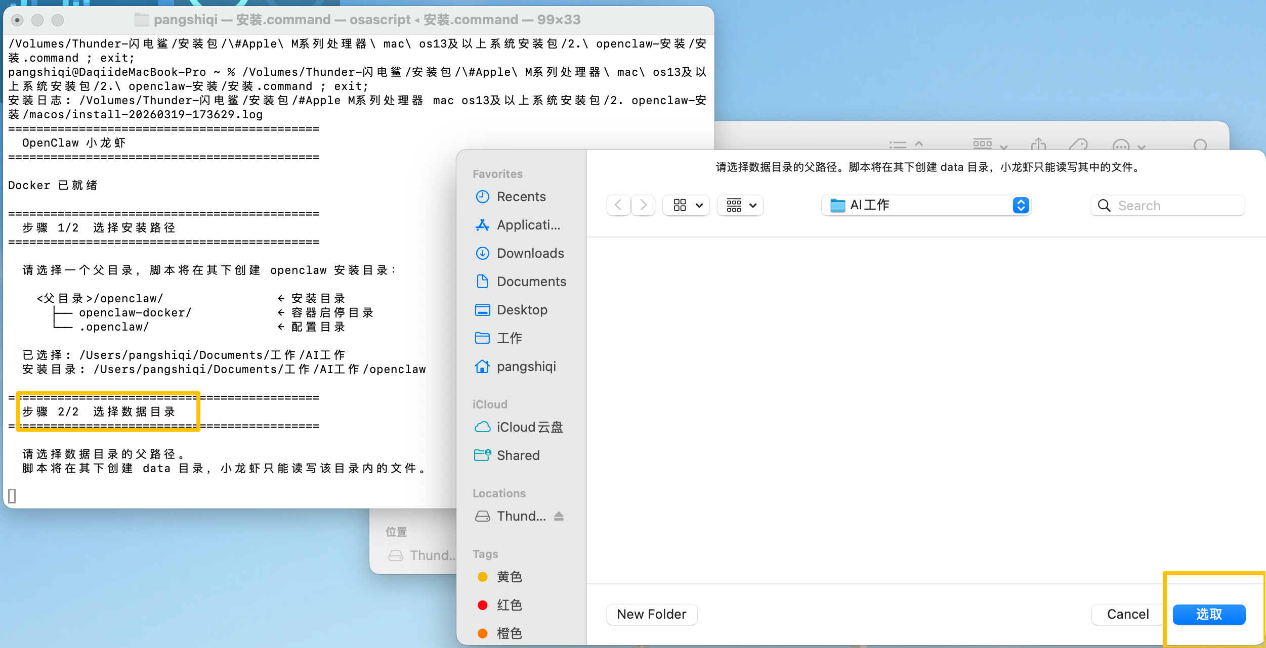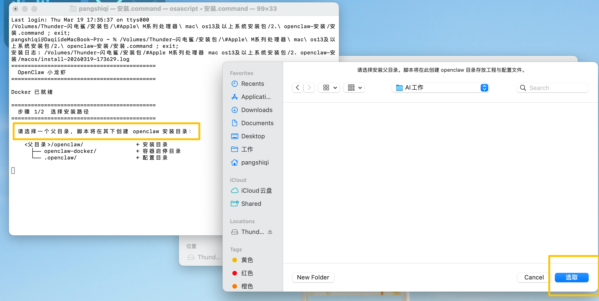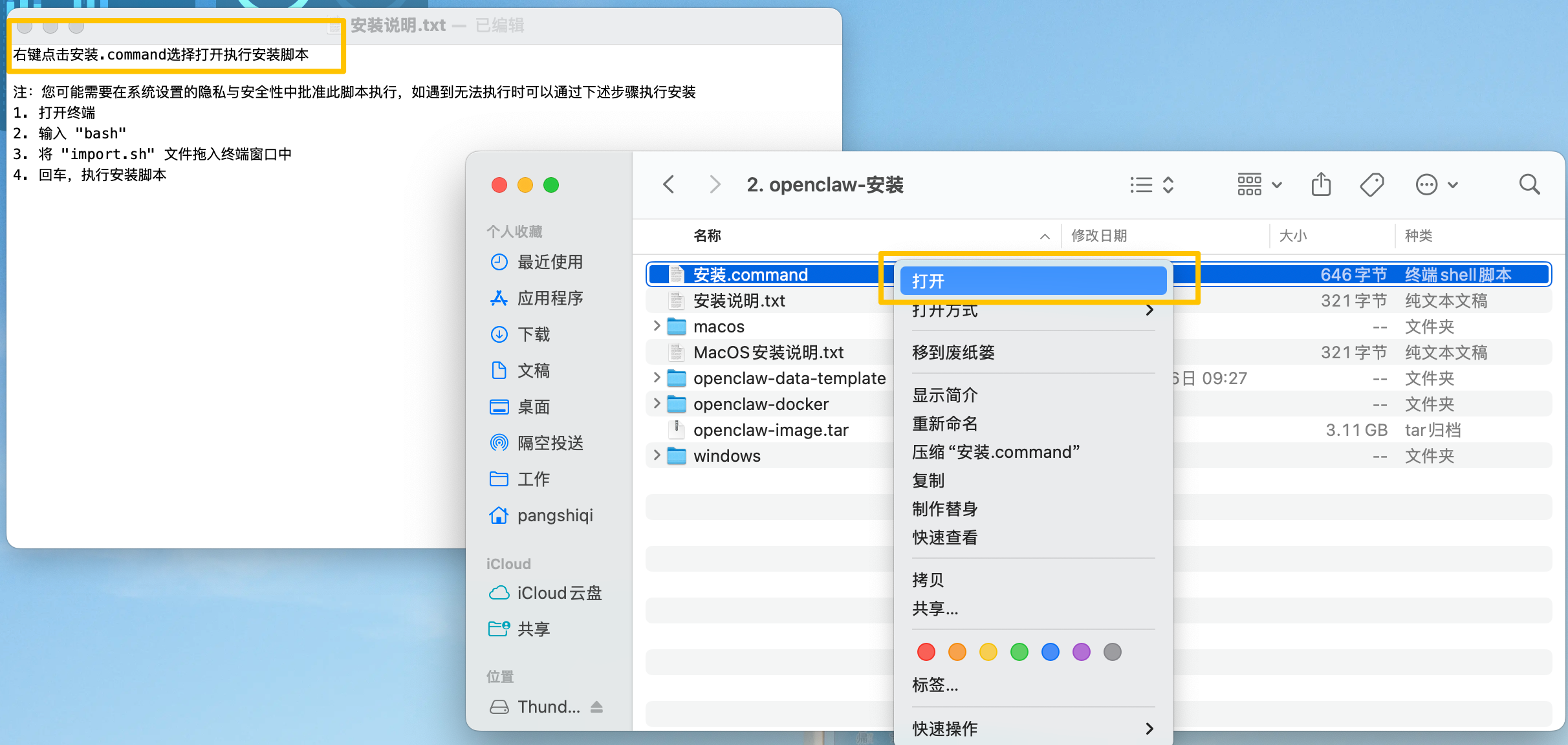 - 执行脚本:打开“openclaw-安装”文件夹,找到名为“安装.command”的文件,使用右键点击并选择“打开”来运行该脚本 。