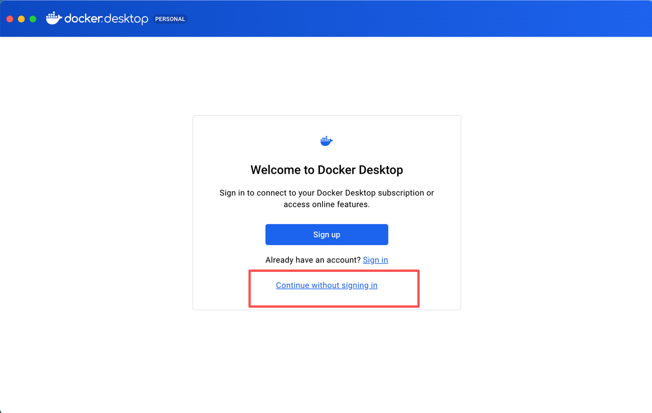 .dmg 文件,将 Docker 图标拖拽到 “Applications” 文件夹中即可。 - 安装完成后,请从“应用程序”中启动 Docker Desktop。首次启动根据提示操作,选择 “Continue without signing in” 即可。