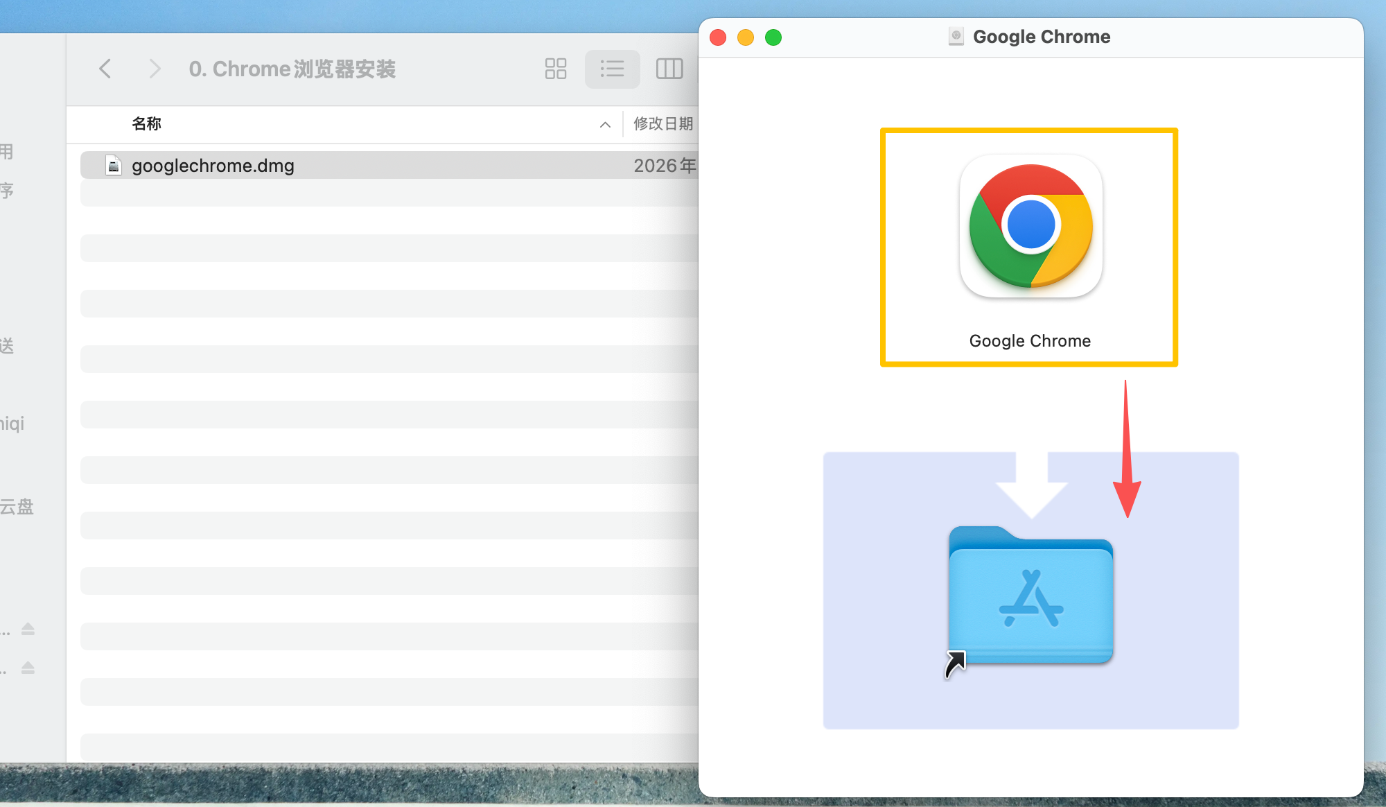 如果您的电脑尚未安装,可以从解压后的部署包内每个系统版本的 “0. Chrome浏览器” 文件夹中找到安装程序: macOS 用户:选择 googlechrome.dmg