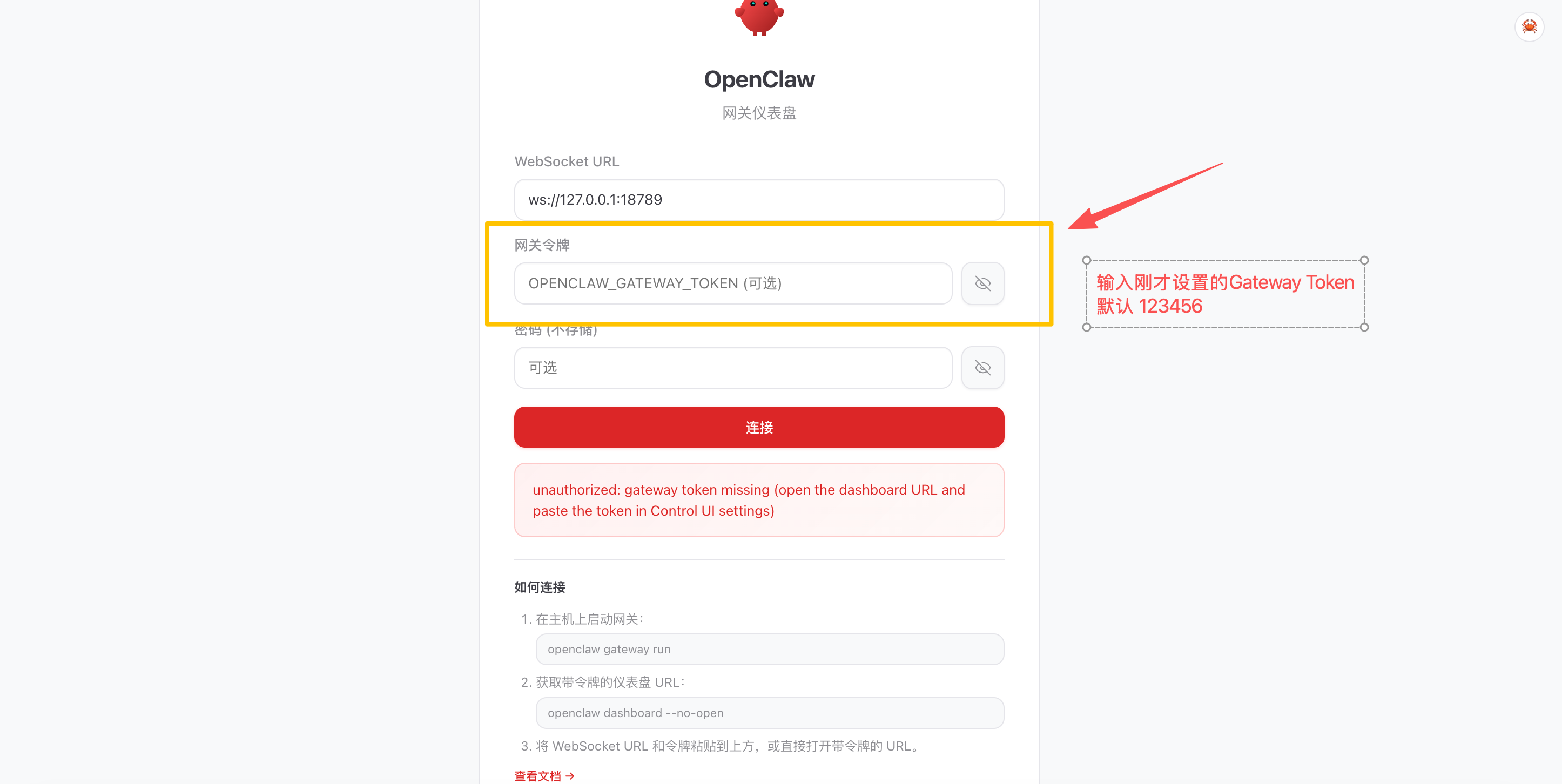 - 连接控制面板:当 OpenClaw 的网页界面自动弹出时,说明部署已经成功!在界面中的“网关令牌”输入框内,填入您刚才设置的 Gateway Token(默认: